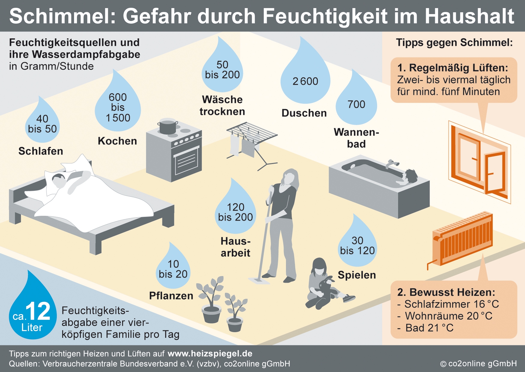 Beim Baden, Kochen, Wäschetrocknen und auch beim Schlafen fallen in einem Vier-Personen-Haushalt pro Tag fast 10 Liter Wasser in Form von Dampf an. Durch regelmäßiges Lüften kann jedoch ein ungesundes Wohnklima ausgeschlossen und Schäden an der Bausubstanz verhindert werden und zusätzlich sparen Sie auch noch Heizkosten.
